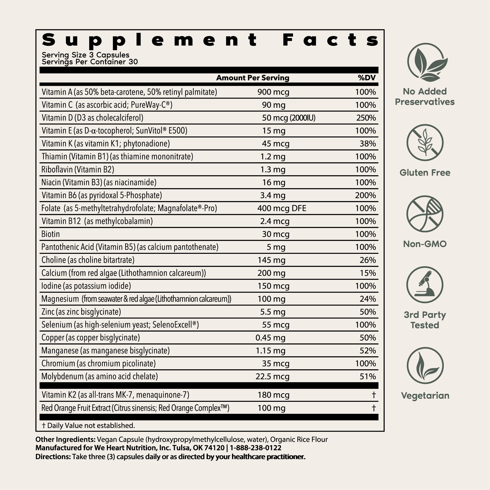 The second class are Whole-Food vitamins. For these vitamins they take vitamins and minerals and add them to organic food-based elements. For example, they may take an inactive yeast “stew” and feed it multiple vitamins and minerals. Is it is much harder to get as many daily nutrient levels in each serving when compared to products like ours. Additionally, the majority of these brands have been acquired by major corporations who are known compromise on quality and values.